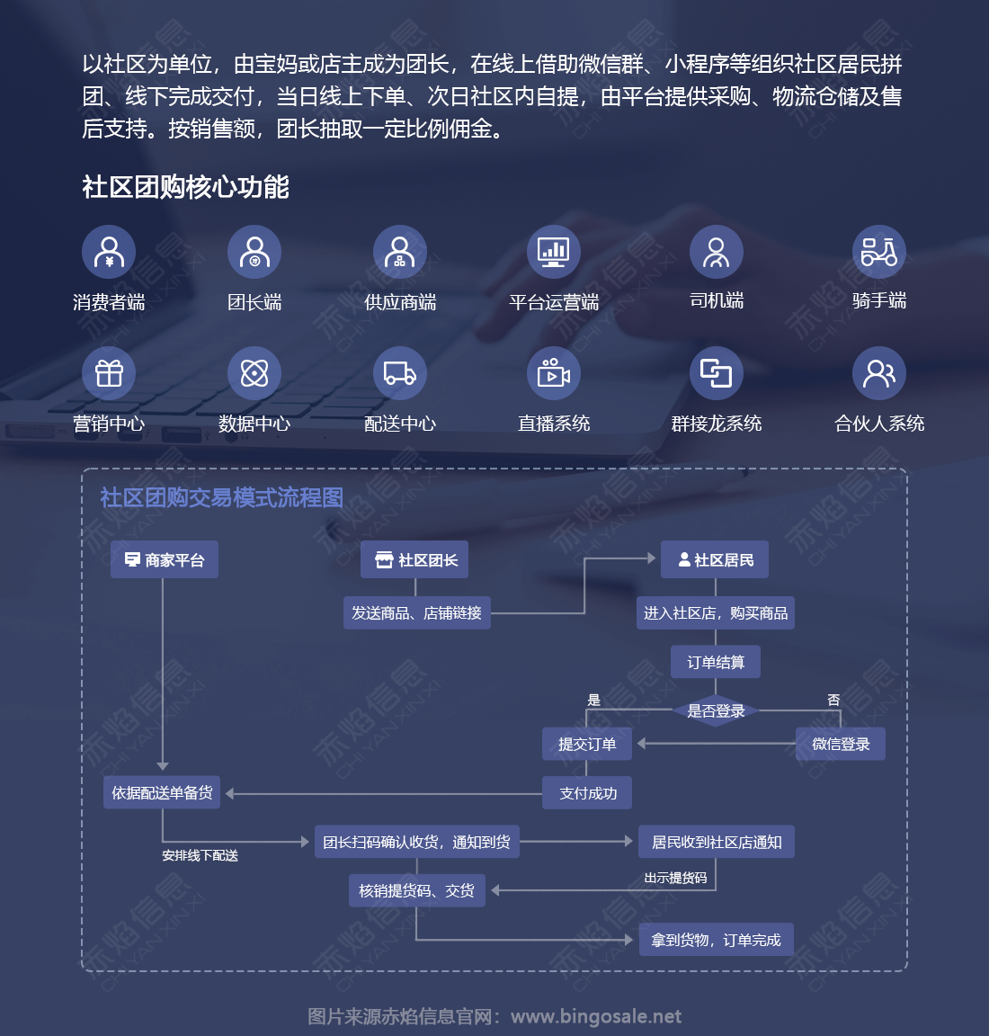 以社區為單位,由寶媽或店主成為團長,在線上借助微信群、小程序等組織社區居民拼團、線下完成交付,當日線上下單、次日社區內自提,由平臺提供采購、物流倉儲及售后支持。按銷售額,團長抽取一定比例傭金。